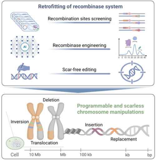 基因组编辑技术作为生命科学领域的一项重要突破,为基础研究和应用开发提供了技术支撑。以CRISPR及其衍生技术为代表的编辑系统通过可编程的向导RNA引导Cas9等核酸酶靶向基因组特定位点,被广泛应用于特定碱基和短片段DNA的精准编辑。但是,大片段DNA编辑至今仍面临挑战,对数千乃至数百万碱基的精准操纵更是领域的核心难题。突破该技术壁垒,将为实现大尺度基因组操纵提供关键支撑——包括基因关键区域的替换与修复、功能基因序列的完整插入、基因簇的删减或重定位以及人工构建基因组结构变异等。这不仅可以推动遗传操纵技术革新,更将成为疾病治疗与作物改良技术瓶颈的突破口。理想的大片段DNA编辑工具可以同时支持染色体水平的多种编辑类型,包括精准插入、替换、删除、倒位与易位等。然而,现有工具在编辑效率、尺度、精准性及类型多样性等方面存在不足。