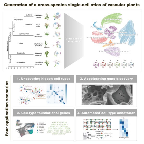 近日,中国科学院分子植物科学卓越创新中心、植物高效碳汇重点实验室王佳伟研究组突破了植物单细胞转录组测序底层技术难点,绘制出世界首张维管植物整合细胞图谱。研究通过系统鉴定维管植物各类细胞的底层基因,突破了基因高效挖掘的瓶颈,为植物发育生物学研究提供了全新的研究范式。