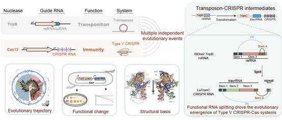 CRISPR-Cas系统是原核生物的获得性免疫系统。以Cas9和Cas12为效应蛋白的type II类和V类CRISPR系统已成为当前基因组编辑的重要工具,广泛应用于基础研究、医学和农业等多个领域。已有研究表明,Cas12起源于IS200/605和IS607转座子家族编码的TnpB核酸酶。从TnpB到Cas12的进化被认为是“多次独立起源”的转座子-免疫系统复杂进化事件。阐明CRISPR系统从转座子起源的分子机制,是该领域长期悬而未解的科学难题。