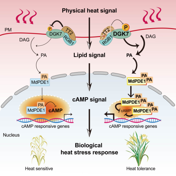 为解析PA信号的后续传递机制,团队通过功能域筛选,鉴定到具有PA结合域和磷酸二酯酶催化域的双功能蛋白MdPDE1。该蛋白能够感知PA浓度变化,与PA结合并被激活,转移到细胞核中,通过水解环磷酸腺苷(cAMP)降低核内cAMP水平,完成脂质信号向cAMP信号第二步转换。点突变实验证实,MdPDE1的PA结合能力是其核定位与功能执行的关键。最终,核内cAMP水平下降触发转录重编程,上调小热激蛋白和活性氧清除酶等相关基因的表达,从而在细胞层面建立起一套完整的耐热响应机制,能够显著增强水稻的高温耐受能力。G蛋白—DGK7—PA—MdPDE1—cAMP信号途径的完整解析,阐明了植物从细胞膜感知到核内基因表达调控的热信号全程解码机制,为剖析植物逆境响应机制提供了新的分子框架。