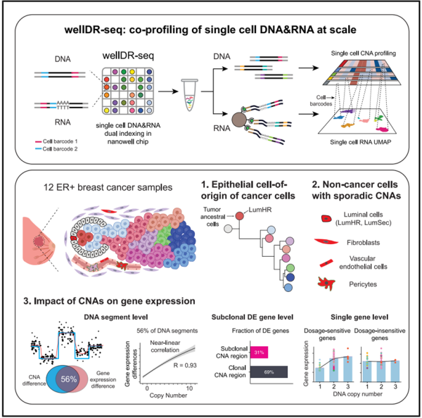 近日,中国科学院分子细胞科学卓越创新中心等,开发出高通量单细胞基因组和转录组联合测序方法wellDR-seq,对12例乳腺癌中超过3万个单细胞进行双组学解析。
