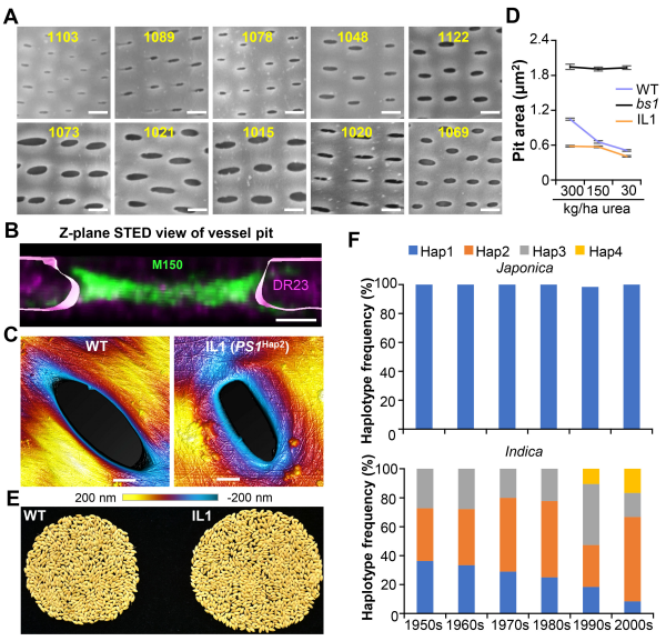 研究发现,水稻核心种质中纹孔形貌的自然变异极为丰富,并通过全基因组关联分析鉴定PS1编码木聚糖乙酰酯酶,为控制纹孔大小的主效QTL基因,且不同单倍型存在功能差异。应用聚焦离子束扫描电镜技术重构纳米精度纹孔完整3D结构进行测量分析发现纹孔为曲率复杂的腔室结构,中间最细的开口尺寸与其木质部运输性能相关,首次将其定义为决定导管运输性能的关键结构,并且PS1Hap2所塑形的纹孔开口更小,运输效率更高。研究发现纹孔处木聚糖为低乙酰化形式,而且PS1Hap2因氨基酸差异具更强的去乙酰化活性,生成更低乙酰化水平的木聚糖,进而促使纹孔边缘纤维素纳米纤丝排列更为紧实,形成开口较小的纹孔。进一步研究证实,携带PS1Hap2的水稻氮素运输效率提高,并在高低氮下均可提高产量,表明PS1Hap2为优异单倍型。PS1存在明显籼粳分化,在近70年育成的水稻品种中,优异PS1Hap2在籼型中应用比例越来越高,而在粳稻育种中却极少被使用。将PS1Hap2导入粳稻武育粳3号和武密粳,均可提高其小区产量,表明PS1Hap2具有重要育种应用潜力。研究还意外发现,氮素通过PS1调控纹孔大小,并由氮利用效率QTL基因MYB61介导PS1的氮响应。聚合两者优异等位可更加优化纹孔和蒸腾势,进一步提高稻谷产量。