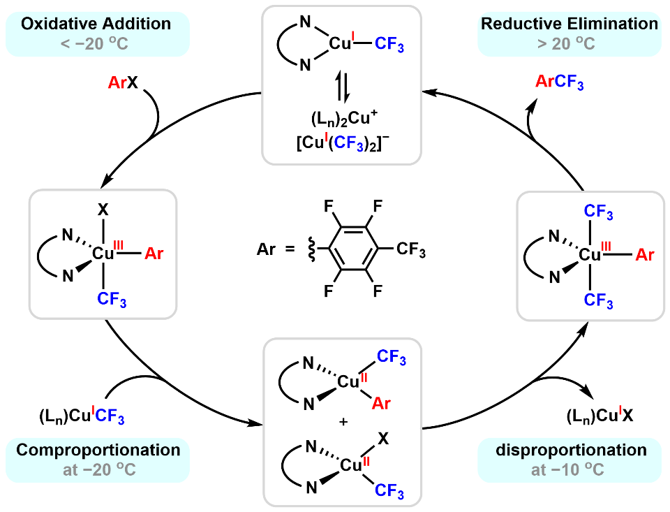 科研团队通过温度调控三氟甲基铜(I)络合物和缺电子芳基碘化物的反应进程,揭示了反应中铜物种复杂的氧化还原行为。团队发现,反应在−20℃下即会发生氧化加成和归中反应,得到铜(II)物种;二价铜物种在−10 ℃下发生歧化反应,得到铜(III)物种和铜(I)物种;铜(III)物种在接近室温下发生还原消除,重生铜(I)物种,完成整个氧化还原循环。上述过程得到核磁共振、电子顺磁共振和紫外-可见吸收光谱的多谱学交叉验证。更重要的是,在多种缺电子芳基碘化物的三氟甲基化反应和乌尔曼联苯合成反应中,类似的反应行为均被观测到,说明其可能普遍存在于多种类型的乌尔曼偶联反应中。